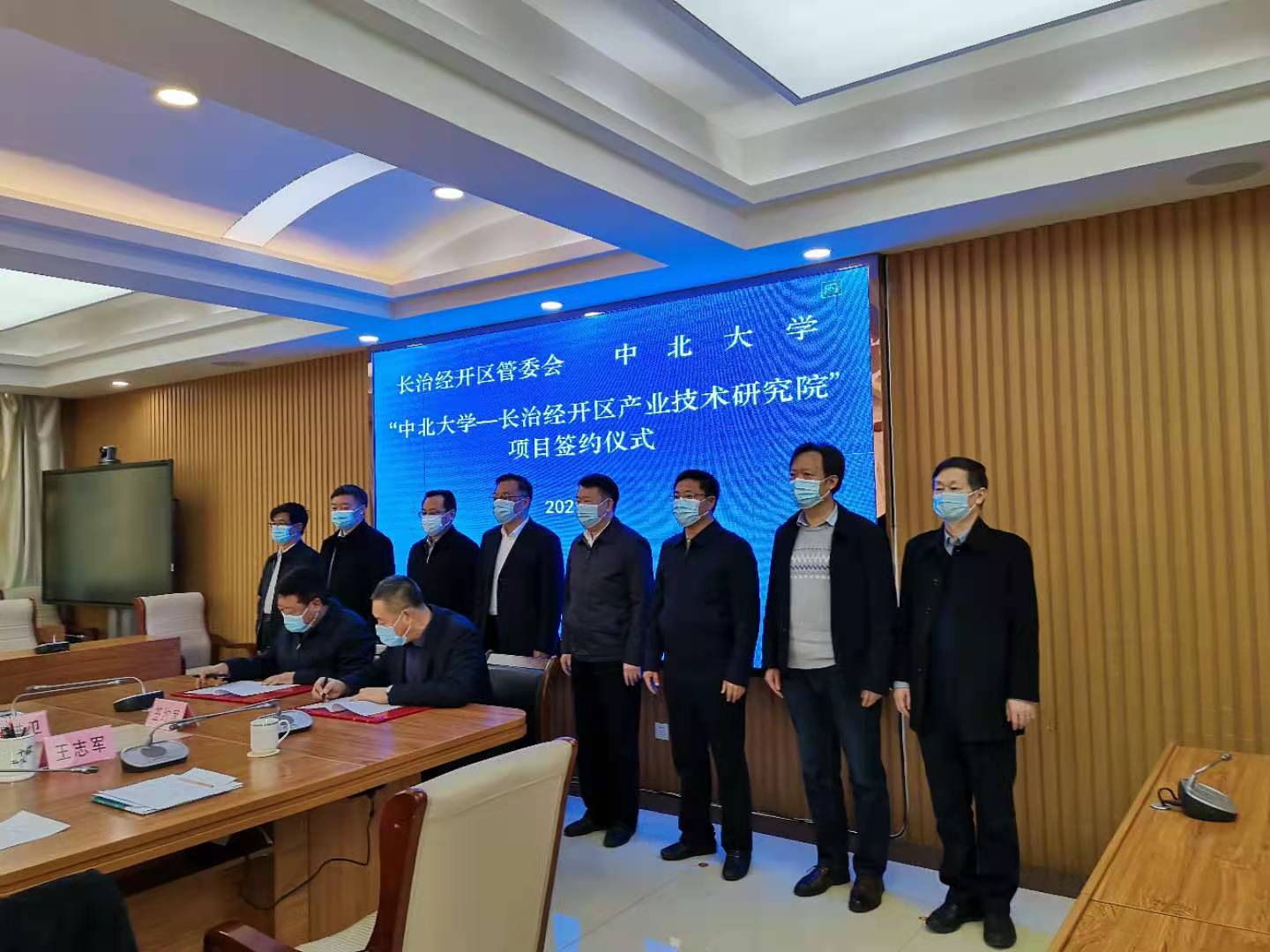 2021年3月22日,在校党委书记沈兴全带领下,李东光副校长和党校办、科学技术研究院、amjs澳金沙门线路首页等单位赴长治进行产学研合作。学院王志军、赵河明、崔俊杰、彭志凌、韩晶老师等参加了合作洽谈。23日上午,在长治市举行了中北大学-长治经开区产业技术研究院签约仪式。长治市市委常委、常务副市长尚日红主持会议,副校长李东光代表学校签署合作协议。校党委书记沈兴全、长治市市长杨勤荣出席签约仪式。