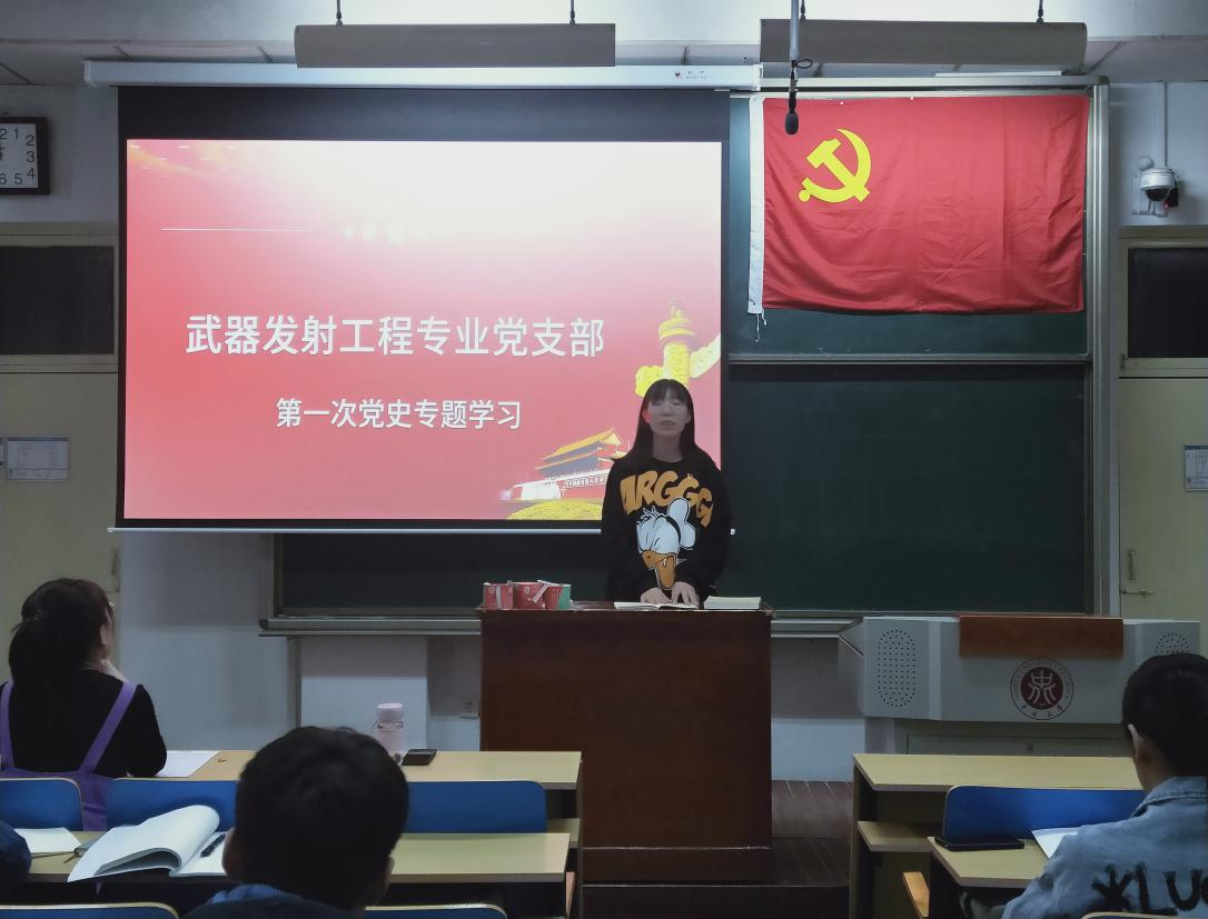 为进一步贯彻落实习近平总书记在党史学习教育动员大会上的讲话,把党的历史学习好、总结好,将党的成功经验传承好、发扬好,武器发射工程专业党支部于2021年3月31日晚七点在11110进行了第一次集体党史专题学习。本次会议由支部副书记杨雪同志主持,支部书记段雪倩老师及支部其他学生党员参加。