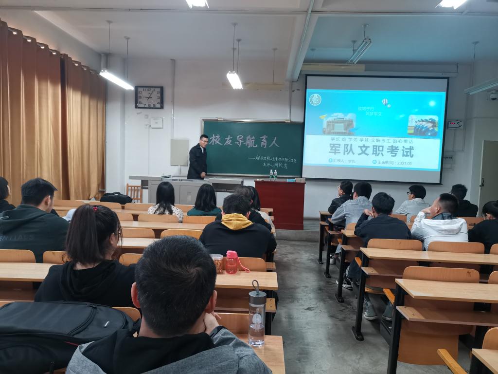 为了给报考部队文职的同学们提供帮助,amjs澳金沙门线路首页特别邀请成功上岸校友周乾秀于2021年5月2日上午,在14号教学楼201教室举办了部队文职人员考试面试经验分享会,会议由就业辅导员王永文老师主持。