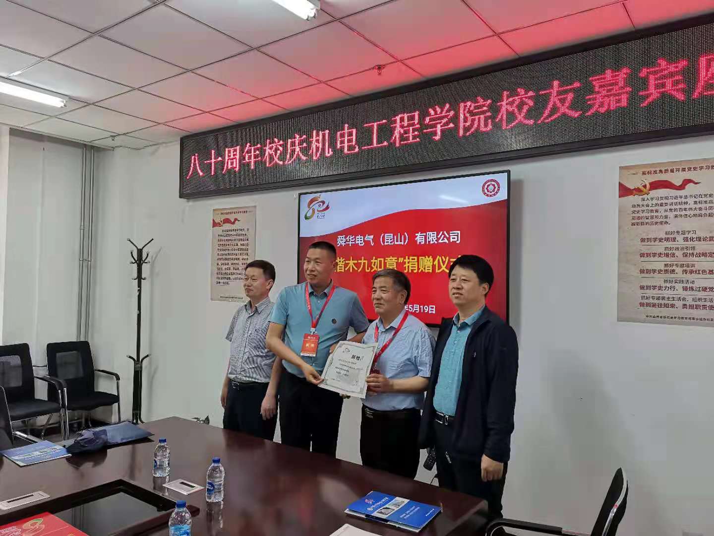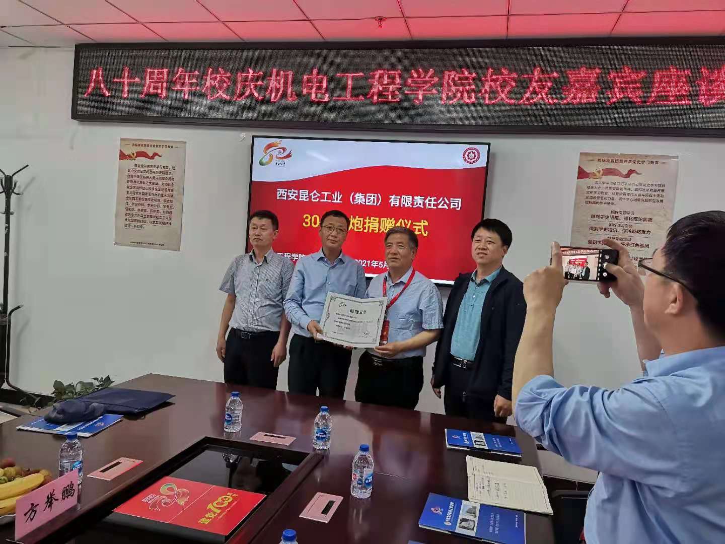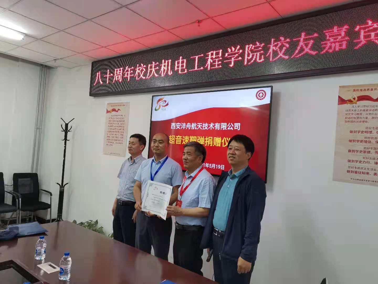 捐赠仪式上,刘亚北董事长代表昆仑工业向学院捐赠了30-4航炮一门,付培杰校友代表西安睿高向学院捐赠“培杰校友奖助基金”300万元,陈士博校友向学院捐赠“楷木九如意”摆件一副,方举鹏校友代表西安沣舟向学院捐赠超音速靶弹一枚,曾建潮副校长向各位代表颁发了捐赠证书。随后,大家共同观看了学校宣传片和企业的介绍,加深了相互理解。各位校友讲述了自己的求学、工作或创业经历,并表达了对母校的深情厚谊。副校长曾建潮代表学校,对校友的捐赠及对母校和学院的关注和支持表示感谢,并祝愿校友事业蒸蒸日上。