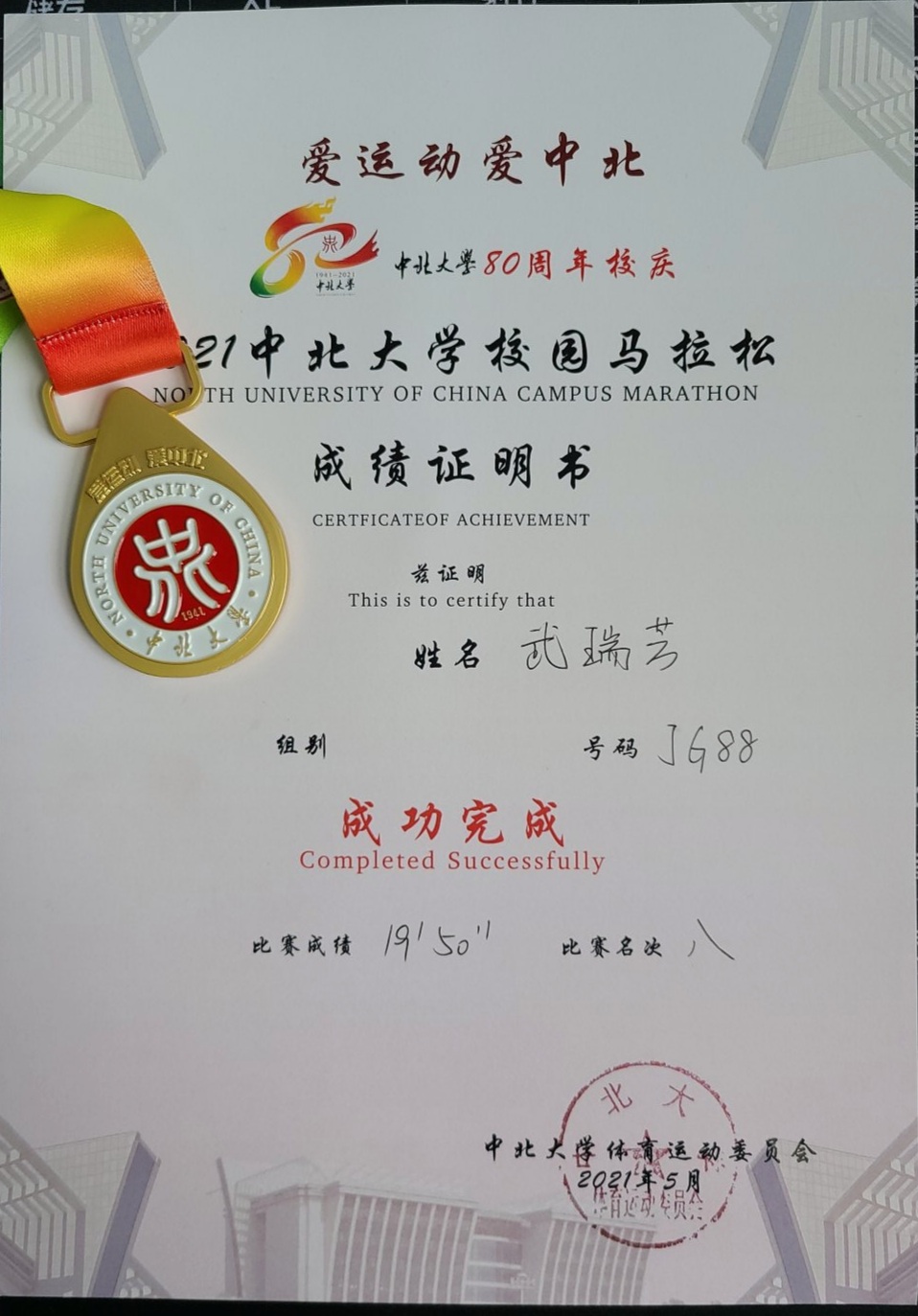 2021年5月25日下午16:00,由中北大学体育运动委员会举办的迎校庆环校园“知行杯”迷你马拉松比赛在我校田径场隆重举行,参赛人员由学生、教职工和校友组成,赛道全程长为4.3公里,起点及终点均设在田径场。我院韩晶、王晓华、武瑞芳、邢培岩四位教师参加了此次比赛。本着“不求胜利,重在参与”的宗旨,我院参赛教工团结互助,顽强拼搏,在规定时间内均完成了比赛,其中武瑞芳老师取得女子组第八名的好成绩。