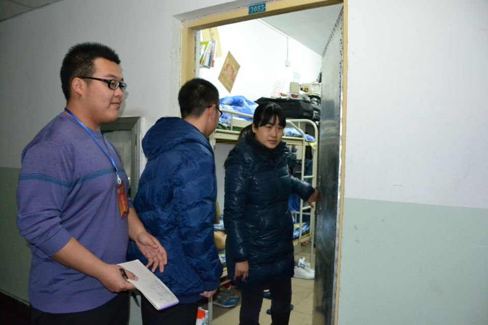 2014年12月10日晚,amjs澳金沙门线路首页党委副书记刘光老师,团委书记王宇鹏老师,学生科科长张丽花老师,学生科段雪倩老师、李晓彧老师、杨博炜老师、祁亚芳老师带领生活部人员对学生宿舍进行了检查,各宿舍情况良好,查寝结果也令人满意,特此通报。