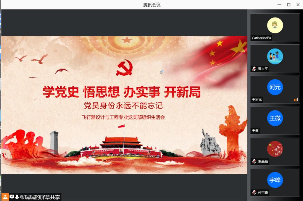 为了回顾过去的党史学习内容,学习习近平总书记在建党一百周年的讲话精神,飞行器设计与工程专业党支部于7月7日通过腾讯会议在线上进行了主题为“学党史,悟思想,办实事,开新局”的组织生活会。