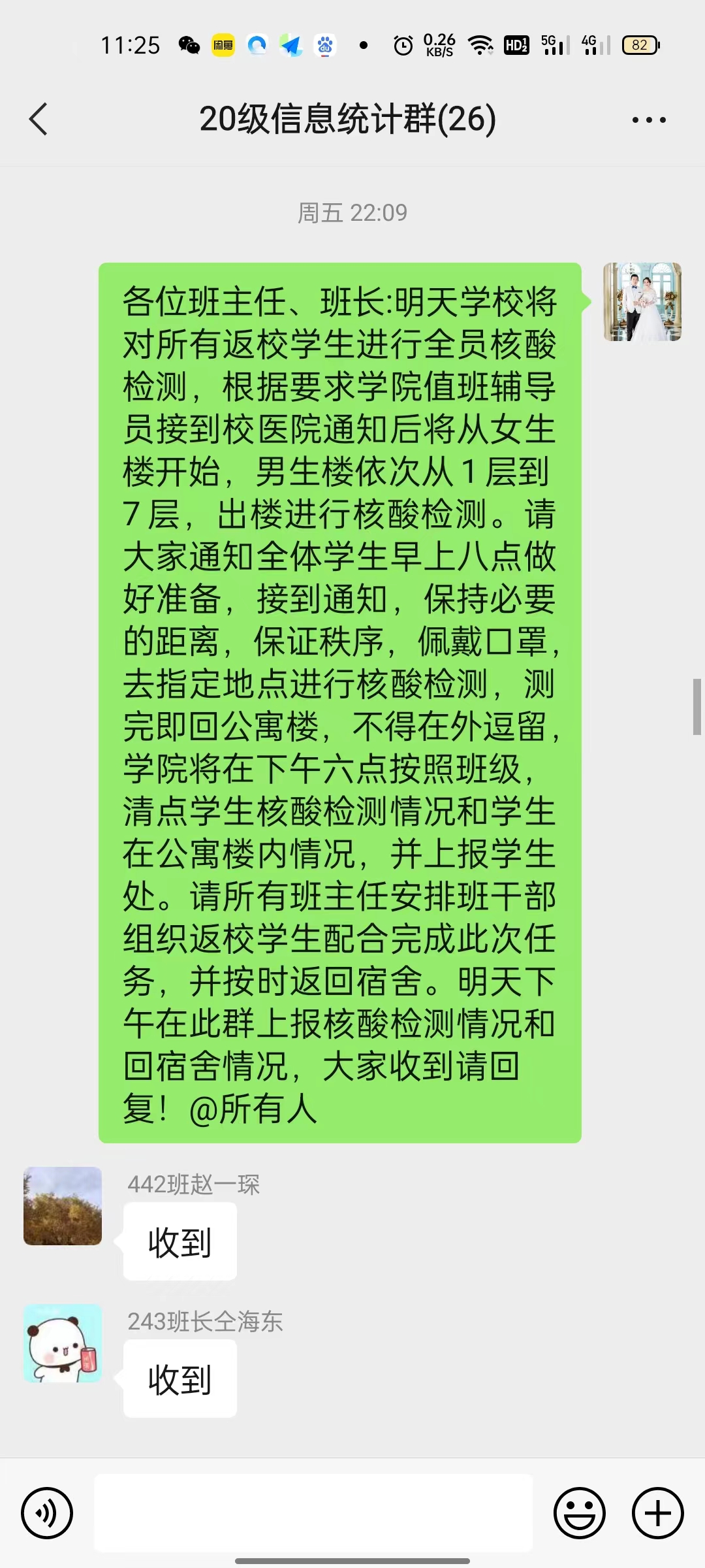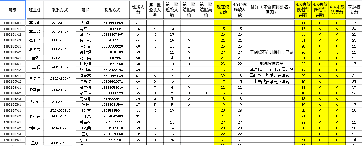 做好精准摸排,确保责任落实。学院辅导员老师每天第一件事就是关注群消息,做好上传下达,及时了解班级情况,收集、汇总、上报等各项数据,做好学生信息台账。学院采用辅导员包干到年级,通过年级群快速传达信息和反馈问题,高效完成了学校、学院安排的各项工作。学院领导多次走访学生宿舍,了解学生信息台账。目前amjs澳金沙门线路首页现有本科生2882人,第一批返校711人,第二批返校805人,第一批请假16人,第二批请假2人,现在校人数1498人。