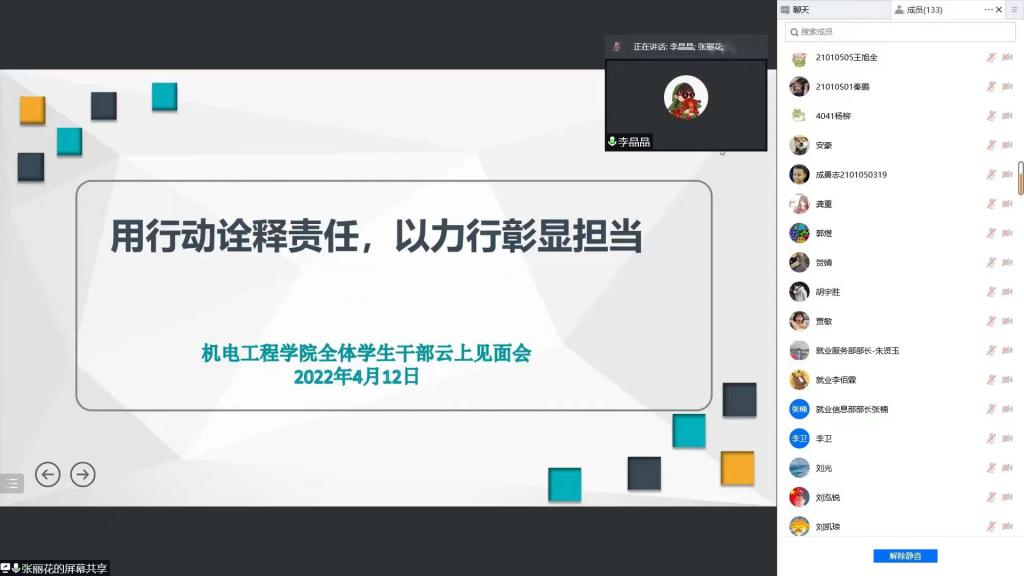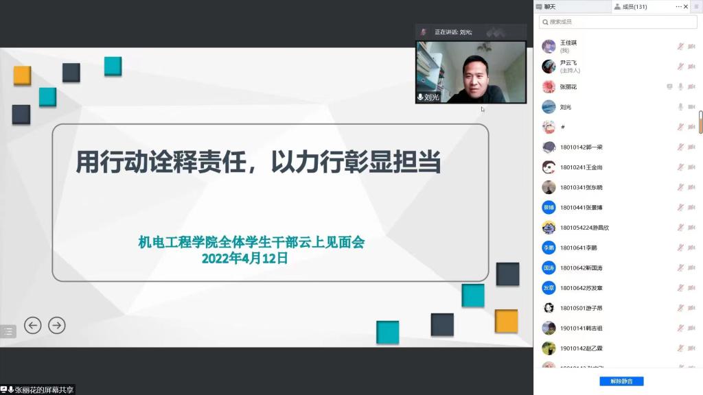 为了能做好amjs澳金沙门线路首页疫情防控管理,改善学生生活学习状况,4月12日16点,amjs澳金沙门线路首页举行了以“用行动诠释责任,以力行彰显担当”为主题的全体学生干部线上见面会,学院党委副书记刘光,院团委书记李晶晶以及全体辅导员老师参会,会议由院学生科科长张丽花主持。