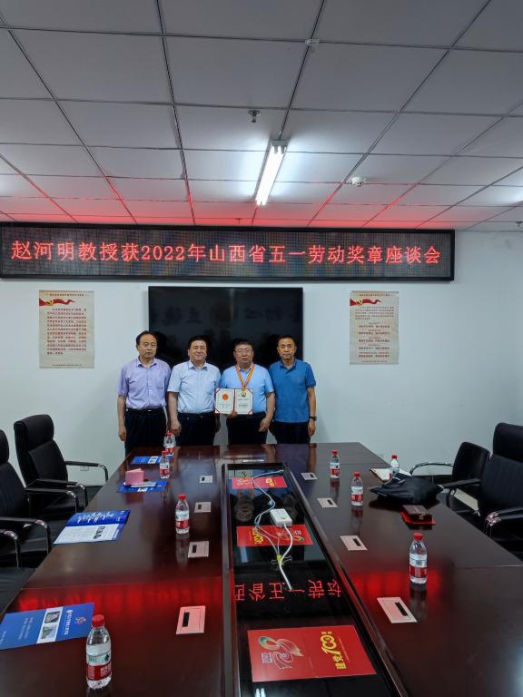 6月10日,山西省总工会党组成员、副主席、省教科文卫体工会主席李忠贵、省教科文卫体工会副主席尹玉平、马仕仁一行来校为我校获得“五一劳动奖章”者赵河明教授颁发奖牌和证书。仪式结束后,李忠贵主席一行来到amjs澳金沙门线路首页实地考察调研赵河明教授工作的岗位和实验室,并召开座谈会。