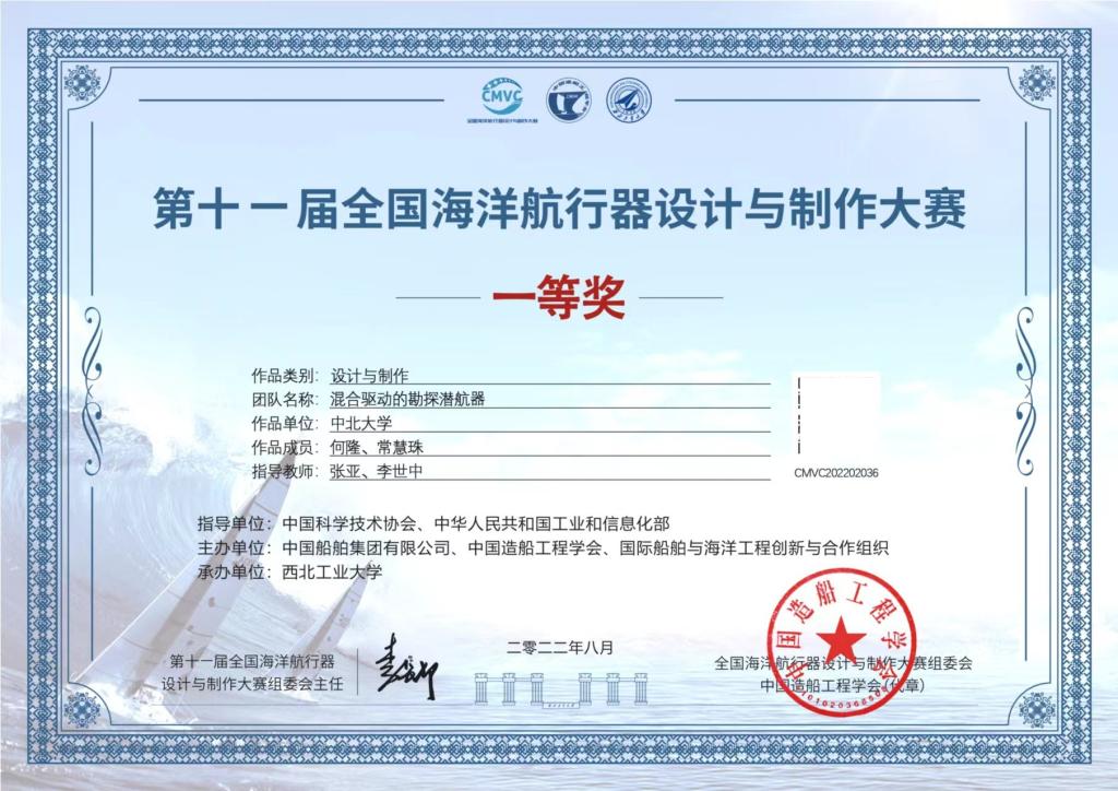 为贯彻海洋强国和人才强国战略,培育船海领域创新人才,8月13日-14日,第十一届全国海洋航行器设计与制作大赛在西北工业大学隆重举行。我院研究生何隆、常慧珠的作品“混合驱动的勘探潜航器”获得国赛“设计与制作--水下指定功能组”的一等奖,是山西省高校中唯一的设计与制作组的全国一等奖。