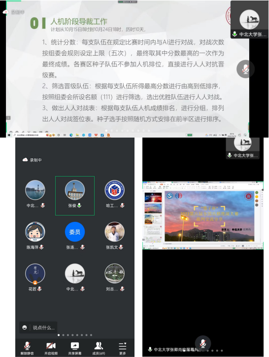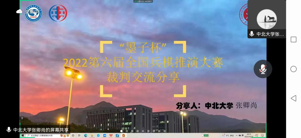 由中国指挥与控制学会主办、中北大学协办的“墨子杯”2022年第六届全国兵棋推演大赛即将开始。为了保证此次大赛的顺利进行,10月10日晚上8点,应全国兵棋推演大赛组委会邀请,我校张卿尚同学为全国兵棋推演大赛导裁进行线上培训会。参加此次培训会主要有大赛组委会负责人张俊、杨南征、张连军等老师,各赛区裁判代表和全体裁判员。