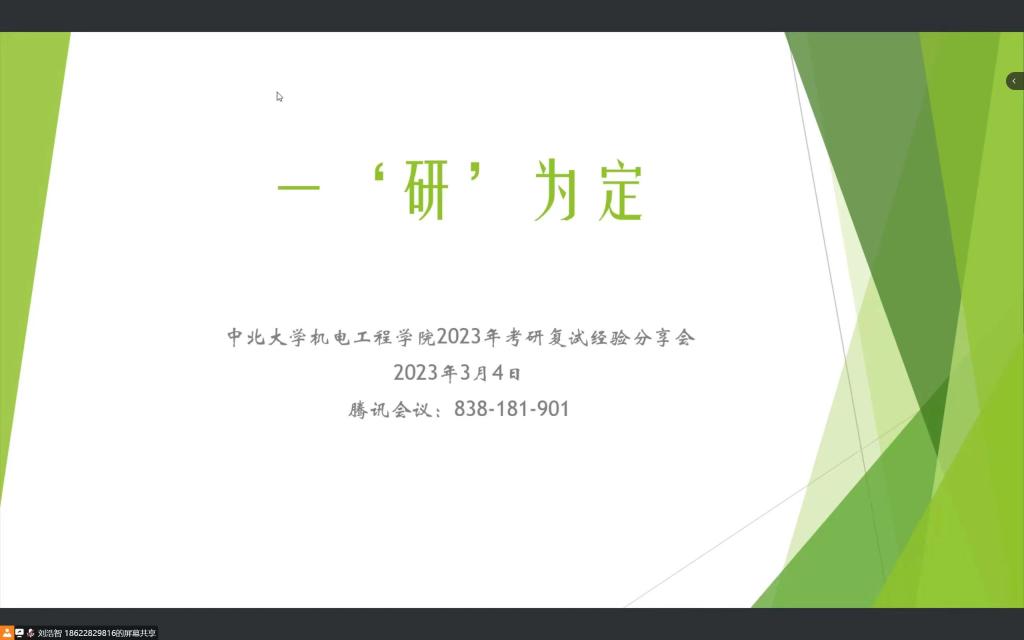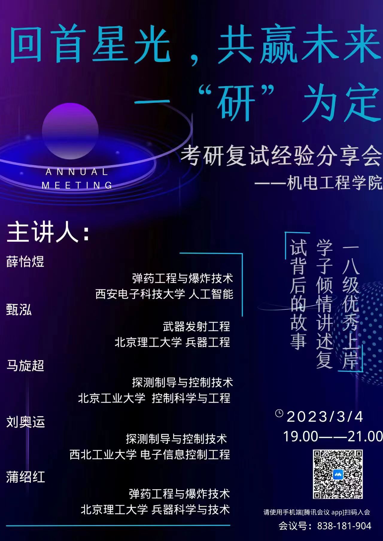 3月4日19:00,amjs澳金沙门线路首页通过腾讯会议平台举办了以一“研”为定为主题的2023年考研复试经验分享会,amjs澳金沙门线路首页党委副书记刘光、amjs澳金沙门线路首页团委书记李晶晶、就业辅导员老师王永文出席了此次会议,我院2022届毕业生薛怡煜(西安电子科技大学)、甄泓(北京理工大学)、马旋超(北京工业大学)、刘奥运(西北工业大学)、蒲绍红(北京理工大学)应邀担任本次会议的主讲人。