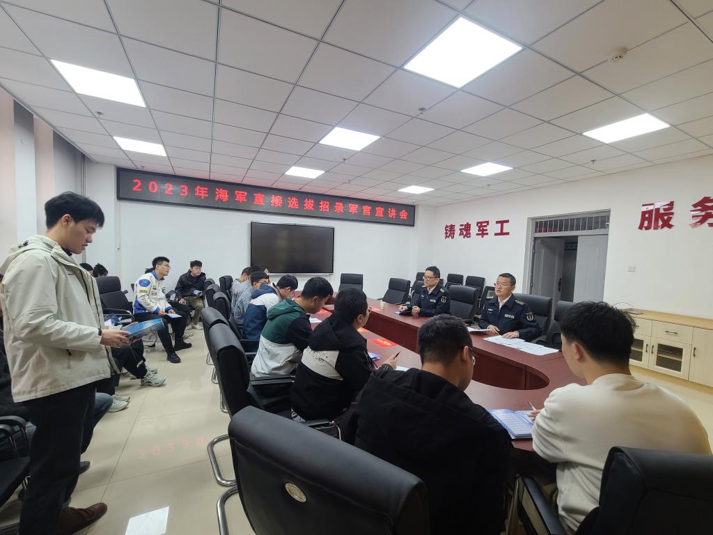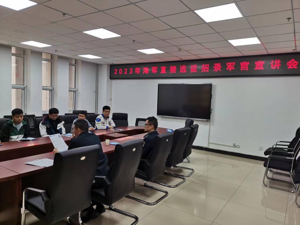 黄政委从单位的科研平台、人文环境、招录程序、人才保障政策、福利待遇等方面做了详细的介绍。随后,齐高工对参加同学提出的招录岗位的条件要求等问题做了一一解答,并对参加研究生的简历进行筛选。最后,黄政委表示,非常期待我院研究生能够加入海军,用信仰、梦想、智慧、科技的力量,守护万里海疆。