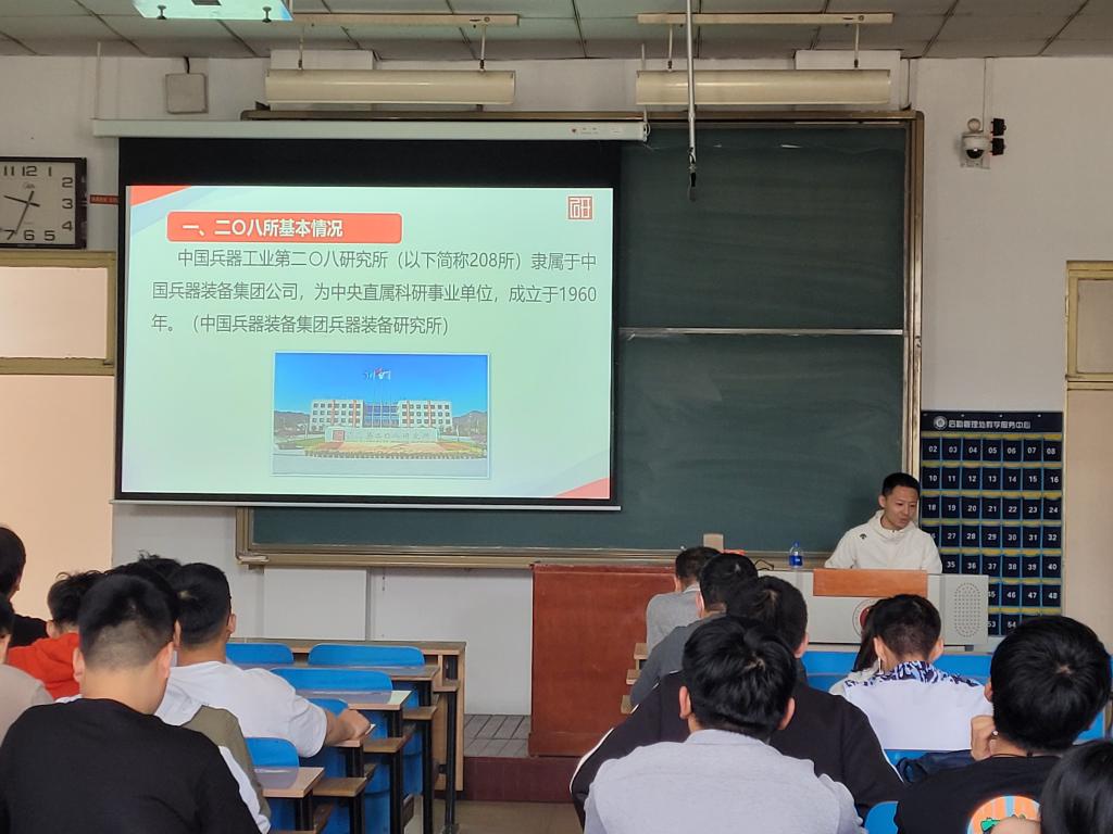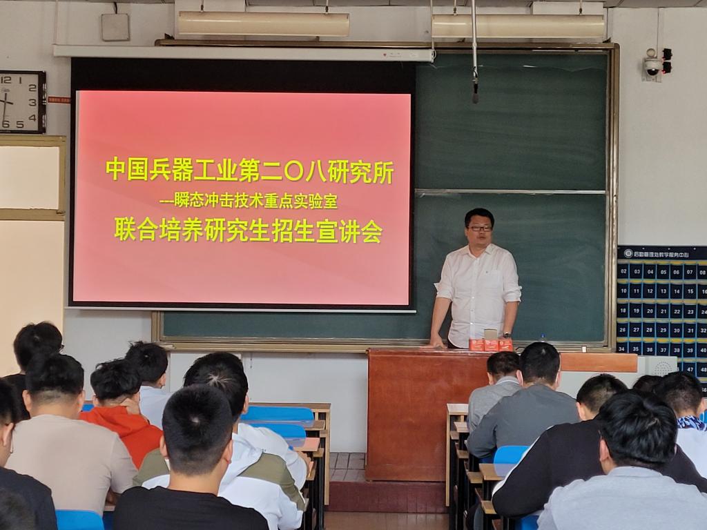 5月17日上午在11406H,中国兵器工业第二零八所瞬态冲击技术重点实验室臧立伟高级工程师一行来我院进行联合培养研究生招生宣讲会,我院50余名研究生参加。