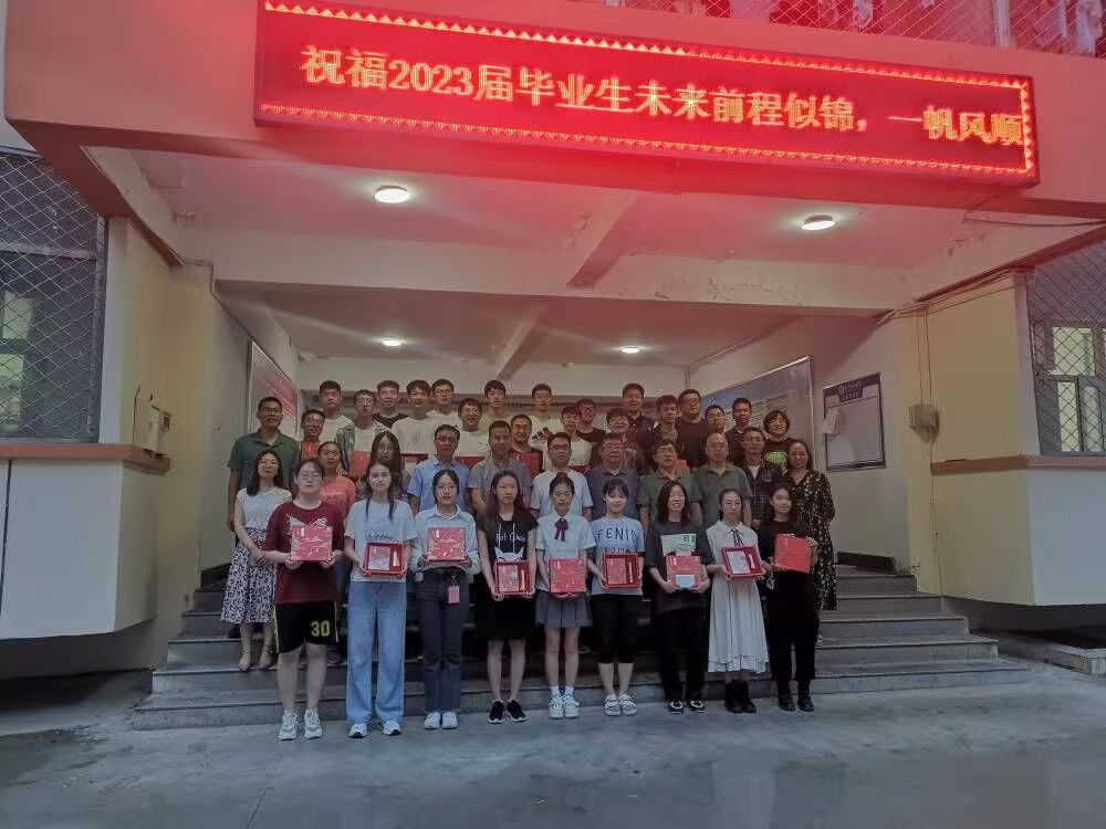 得知有的同学已经找到心仪的工作,有的继续升学进入名校深造,尹院长勉励毕业生无论选择何种道路,都要不断学习新知识,充实自己,在学思践悟中坚定理想信念,继续践行“致知于行”的校训,在持续学习中提升核心竞争力,把握主动权,赢得未来。同时,领导们向2023届毕业生表示最真切的祝贺,送上学院精心准备的纪念品并合影留念。
