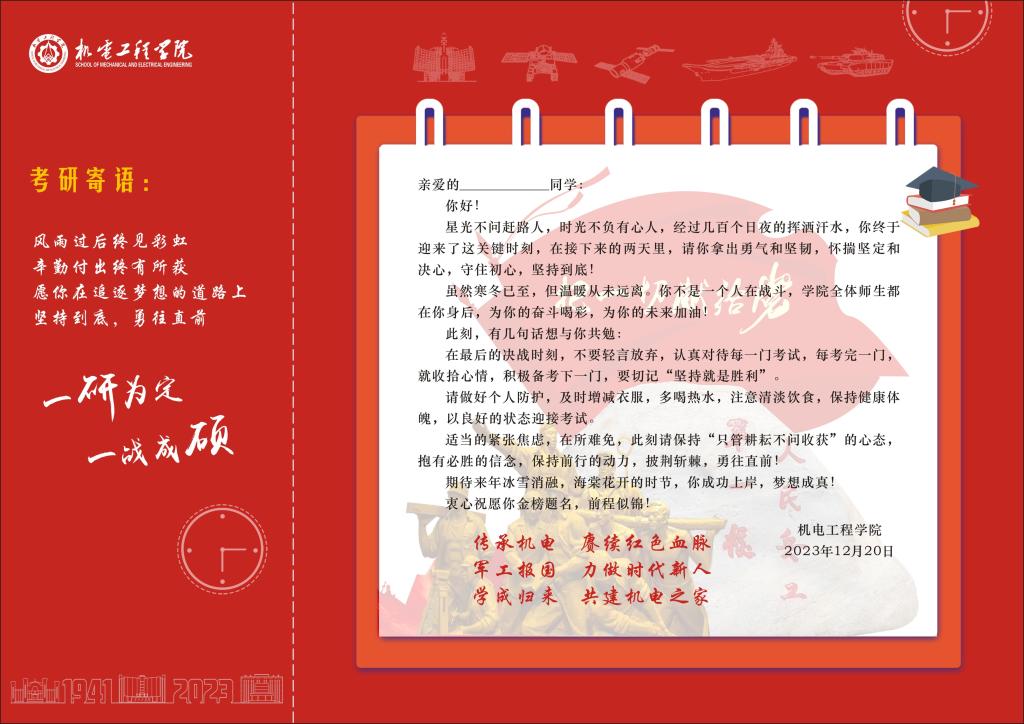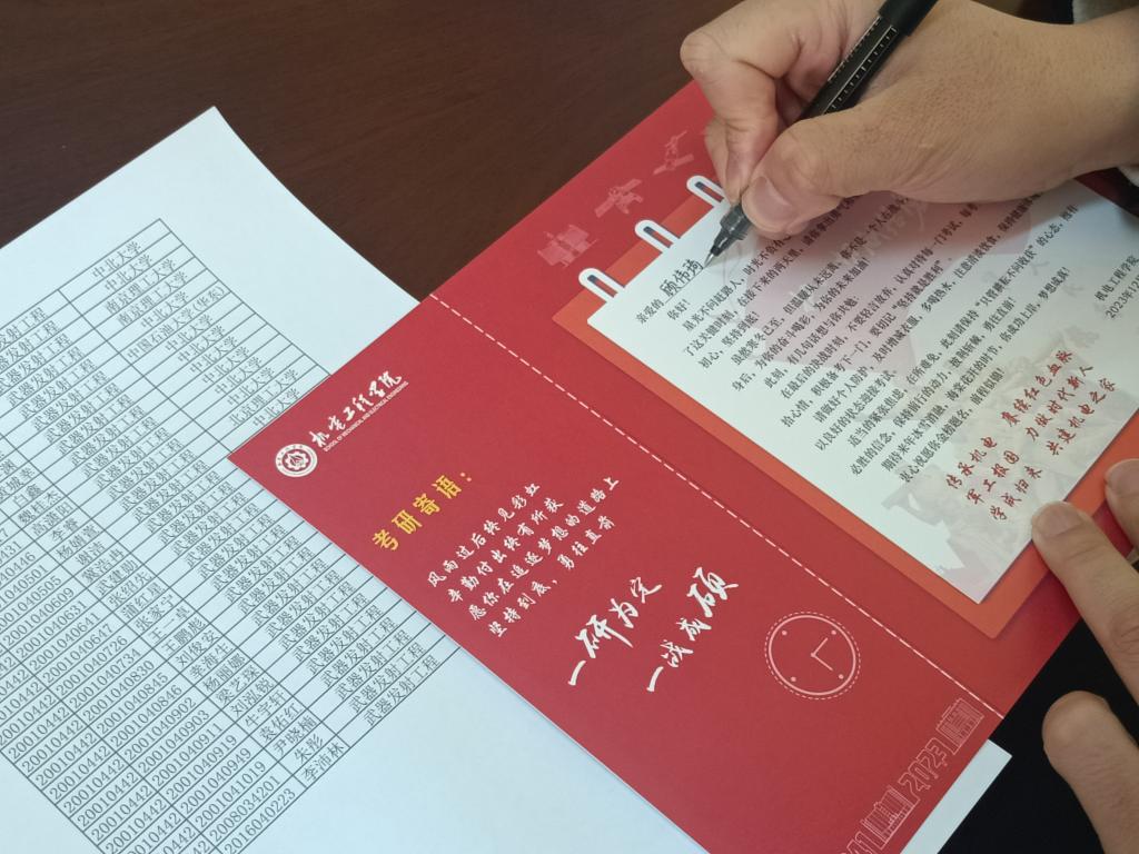 2024年全国硕士研究生招生考试在即,为表达对同学们的关怀鼓励和美好祝愿,为同学们顺利考研保驾护航,amjs澳金沙门线路首页于2023年12月21日在文瀛17号宿舍楼为备战考研的同学们送去了意义非凡的祝福卡和考研文具包。祝福卡精心设计并由学院领导带领全体辅导员和毕业班班主任亲手签署,文具包包含中性笔、涂卡笔、橡皮、小刀、胶棒、尺子和档案袋等考试用具,充分表示了学院对考研学子的深度关怀和美好祝愿。