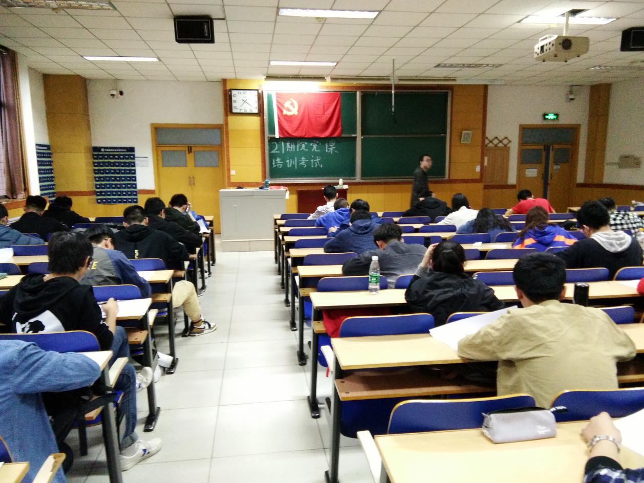 amjs澳金沙门线路首页第27期院党课结业考试于2019年4月21日晚7时在9号楼302、303、501教室组织进行,参加考试的同学为本学期经班级推优选举确定的180名入党申请人。