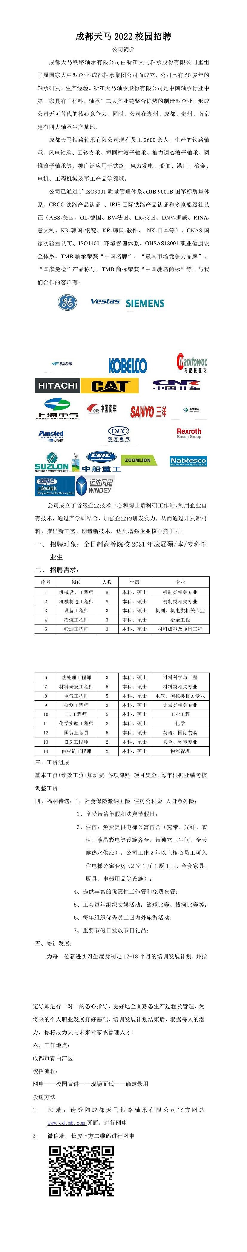 10月29日招聘;成都天马铁路轴承有限公司招聘