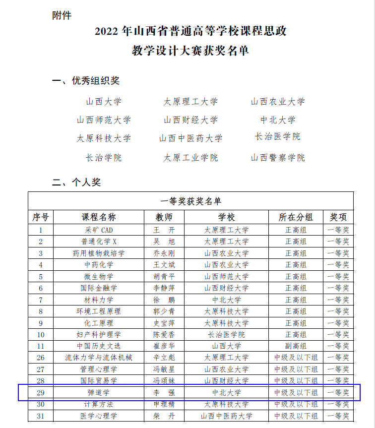 为进一步推进我省高校“课程思政”教学改革,充分发挥教师队伍“主力军”、课程建设“主战场”、课堂教学“主渠道”作用,引导广大教师进一步挖掘思政元素、共享经典案例、交流教学技能、提升教学能力,2022年11月15日,由山西省教育厅主办,山西省高校课程思政建设联盟承办的“山西省普通高等学校课程思政教学设计大赛决赛”在我校举行。通过前期初赛、复赛的层层选拔和淘汰,全省31所高校162名教师参加了决赛。经过激烈角逐,评出一等奖42个,二等奖40个,三等奖80个,优秀组织奖12个。我院教师李强荣获中级组一等奖,实现了我院在此项赛事最高奖项零的突破。