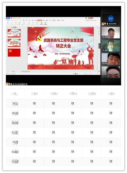 2020年6月20日星期六下午19:00,amjs澳金沙门线路首页武器系统与工程专业党支部于线上腾讯会议召开预备党员转正大会。本次大会由孟浩东同志主持,讨论关于钟良靖、赵然廷、吴浩、黄浩、罗贵元同志的转正问题。出席本次转正大会的有党支部书记刘光老师以及各位支部成员,支部成员应到19人,实到19人。