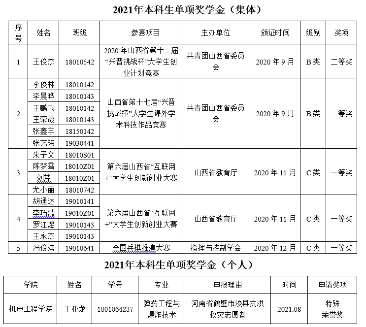 根据《中北大学大学生奖学金评定实施细则(修订)》(校学[2020]11号)、《关于开展2020-2021学年本科生优秀个人、先进集体和奖学金评选工作的通知》([2021年] 第26号),经个人申报、学院审核,现公布获得amjs澳金沙门线路首页2020/2021学年单项奖学金的名单。