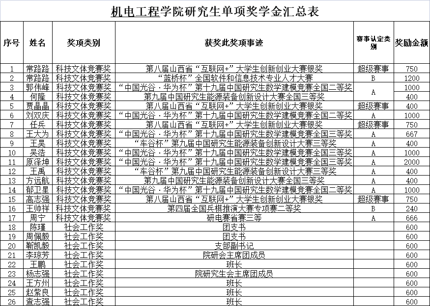 根据《中北大学研究生奖学金管理办法》规定,根据研究生院工作安排,本着“公开、公平、公正”的原则,2023年amjs澳金沙门线路首页研究生单项奖学金评选结果公示如下: