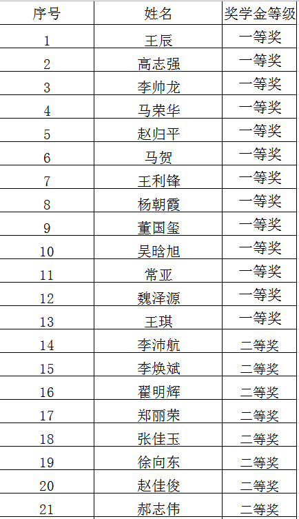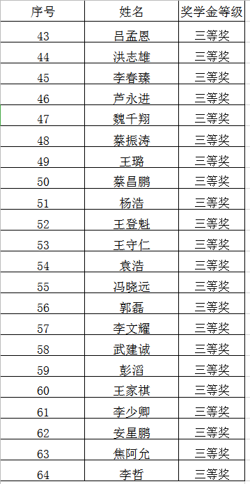 根据《中北大学硕士研究生奖学金管理办法》,按照amjs澳金沙门线路首页研究生综合奖学金的实施细则,研究生综合奖学金评审委员会本着“公开、公平、公正”的原则,评审出2020年2019级研究生综合奖学金获得者,共计64名,如表所示。