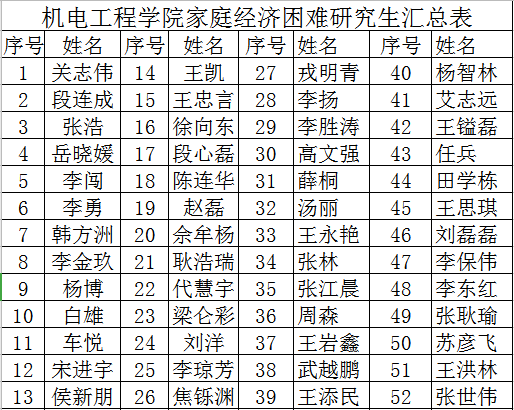 根据《中北大学家庭经济困难学生认定办法》,依据实事求是、客观公平、公开透明、保护隐私的原则,现将2020/2021学年家庭经济困难研究生名单公示如下: