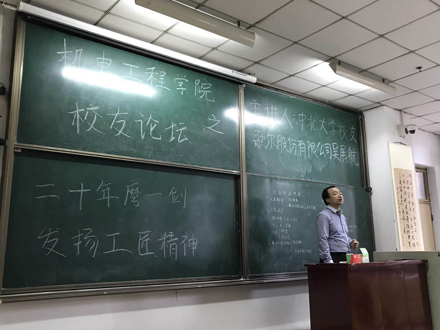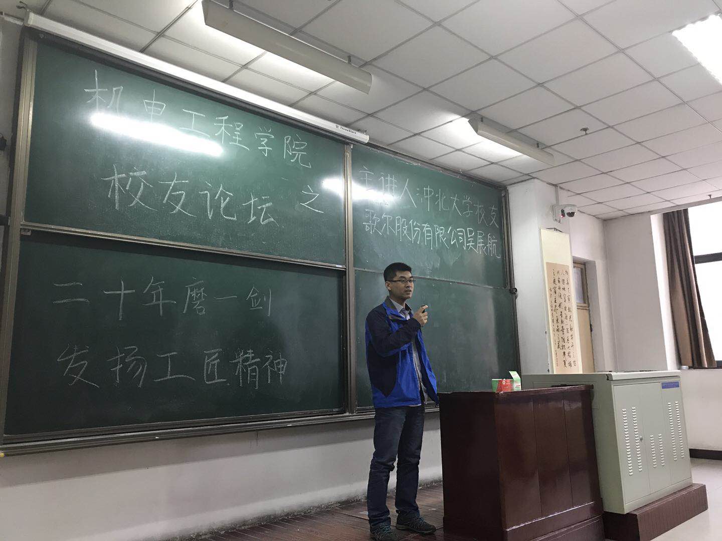 2017年10月23日下午4点,amjs澳金沙门线路首页本学期第二场校友论坛于11112H教室举行。此次校友论坛由我院92级校友、歌尔股份有限公司的吴展航、丁涛主讲,我院党委副书记刘光出席此次论坛。